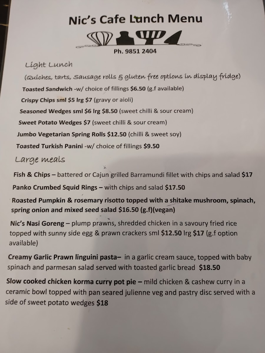 Nic's Cafe and Catering offers a simple, welcoming menu that focuses on comforting café classics and casual bites. Whether you're stopping by for a relaxed breakfast, a light lunch, or a satisfying meal, you’ll find choices that feel familiar yet thoughtfully prepared.